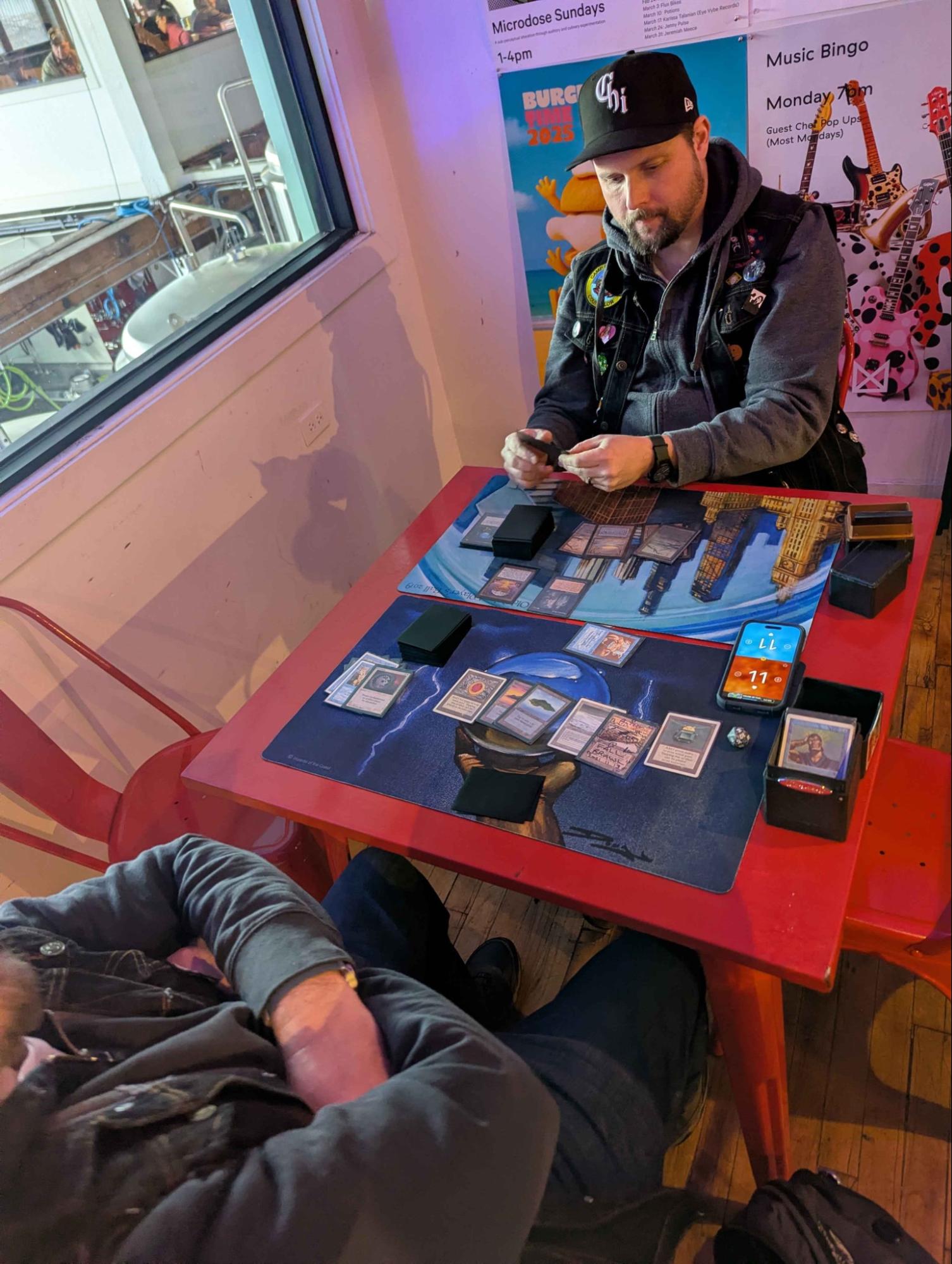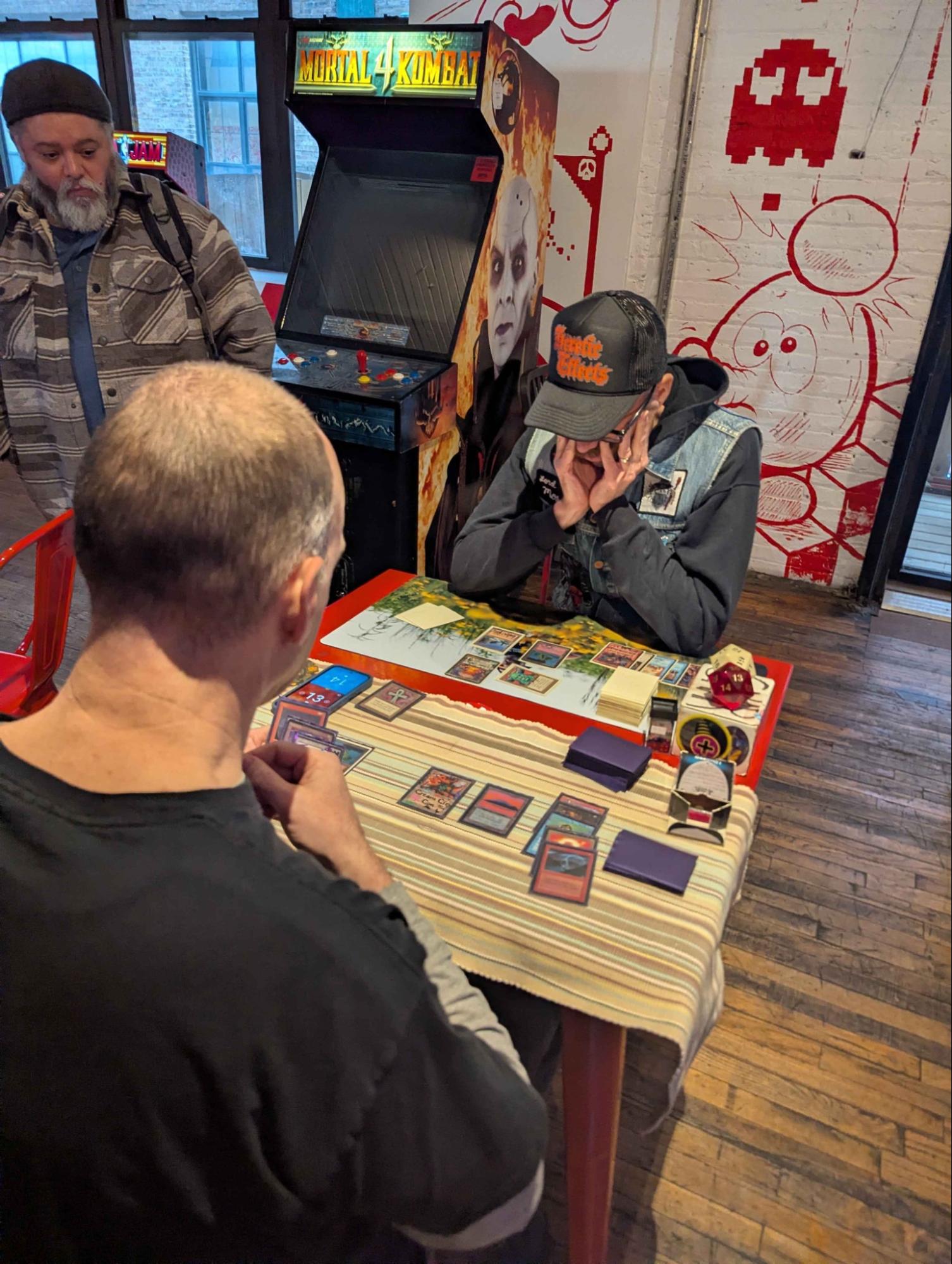 I stopped by the charity auction in the lobby bar and paid a fee for a card. It was packed, with standing room only. After an hour, I wanted to sit down, so I wandered off and eventually met up with Lord Zinni. First we did another lap around the vendor hall, which I ended up doing every day of the event. Then we took the trolley to the chalet, where a few Magic events were going on. We briefly looked around, but decided to just go back to the hotel and get dinner with Lords Semmens and Mith at the ChopHouse, the finest dining at the resort.